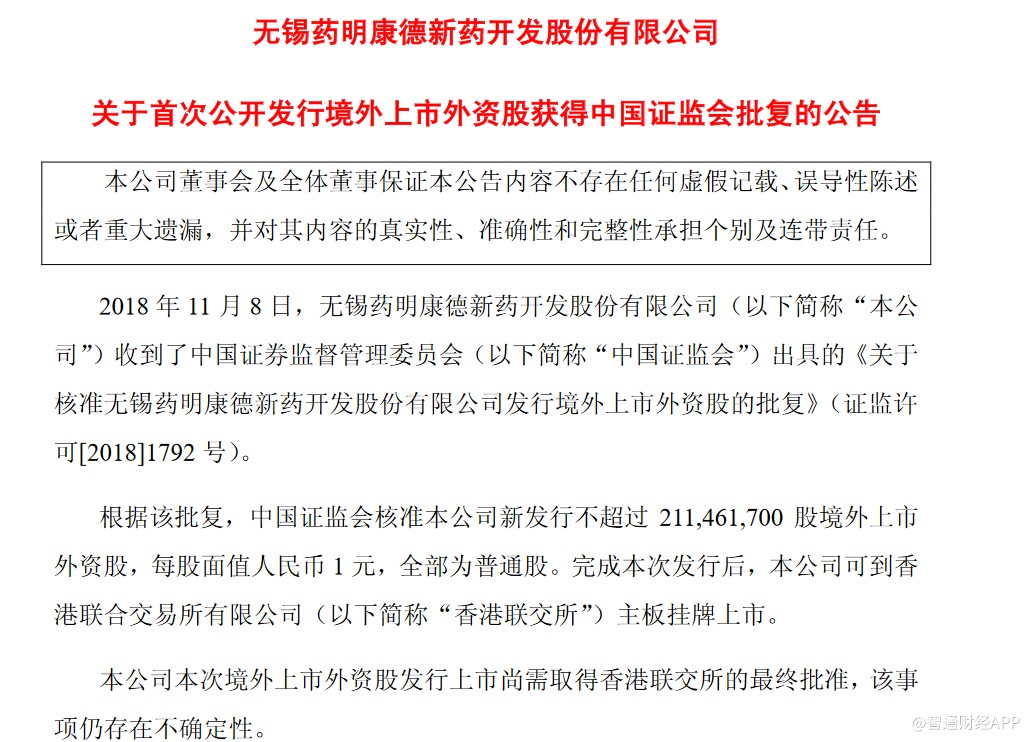 根據(jù)該批復(fù),中國證監(jiān)會(huì)核準(zhǔn)藥明康德新發(fā)行不超過2.11億股境外上市外資股,每股面值人民幣1元,全部為普通股。完成本次發(fā)行后,藥明康德可到香港聯(lián)交所主板掛牌上市。