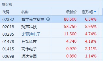 受益于G20結(jié)果超預(yù)期,早盤手機(jī)產(chǎn)業(yè)鏈全線反彈。舜宇光學(xué)(02382)漲6.34%,報80.5港元,瑞聲科技(02018)漲5.95%,報58.75港元,比亞迪電子(00285)漲4.74%,報11.5港元。
