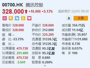 藍(lán)籌方面,騰訊(00700)早盤漲5.13%,報328港元,大市盤前成交額為11.54億港元。其他重磅藍(lán)籌方面,瑞聲科技(02018)漲5.95%,報58.75港元,中海油(00883)漲5.86%,報14.08港元,中石油(00386)漲4.92%,報5.76港元,中石化(00386)漲3.76%,報6.9港元。