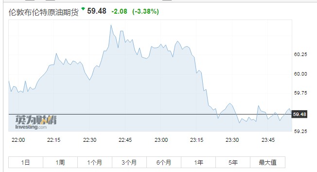 布倫特原油期貨報59.48美元/桶,跌3.38%。