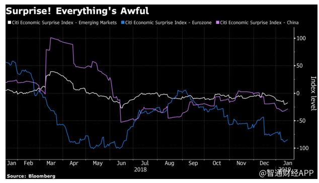 兩位分析師表示,歐洲和新興市場的經(jīng)濟(jì)驚喜指數(shù)均陷入負(fù)值區(qū)間。而標(biāo)普500指數(shù)成份股公司約有三分之一的營收來自海外,海外市場的進(jìn)一步疲軟可能最終會令美國國內(nèi)的增長前景變得黯淡。此外,美國國內(nèi)的經(jīng)濟(jì)增長前景在一定程度上也已經(jīng)因美國政府部分關(guān)門而減弱。