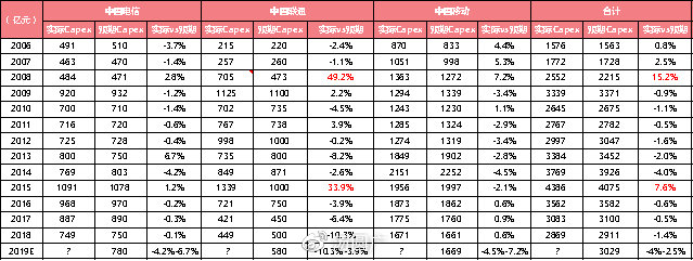隨著3月底三大運(yùn)營(yíng)商公布的2019年資本開(kāi)支展望,顯示資本開(kāi)支見(jiàn)底回升,2019年三大運(yùn)營(yíng)商披露年度資本開(kāi)支計(jì)劃合計(jì)3031億,同比增長(zhǎng)6%,結(jié)束3年下滑。
