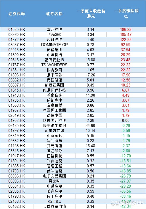 另外,截至一季度底,36只新股中,共有14只股失守發(fā)行價,破發(fā)率為39%。值得的注意的是,相比于2018年港股新股70%的破發(fā)率,2019年一季度的破發(fā)率有明顯的下降。其中,天瑞汽車內(nèi)飾以42.36%,成為一季度市場表現(xiàn)最差新股。而嘉藝控股則以196.23%的漲幅,成為一季度市場表現(xiàn)最牛新股。(陳嘉林)