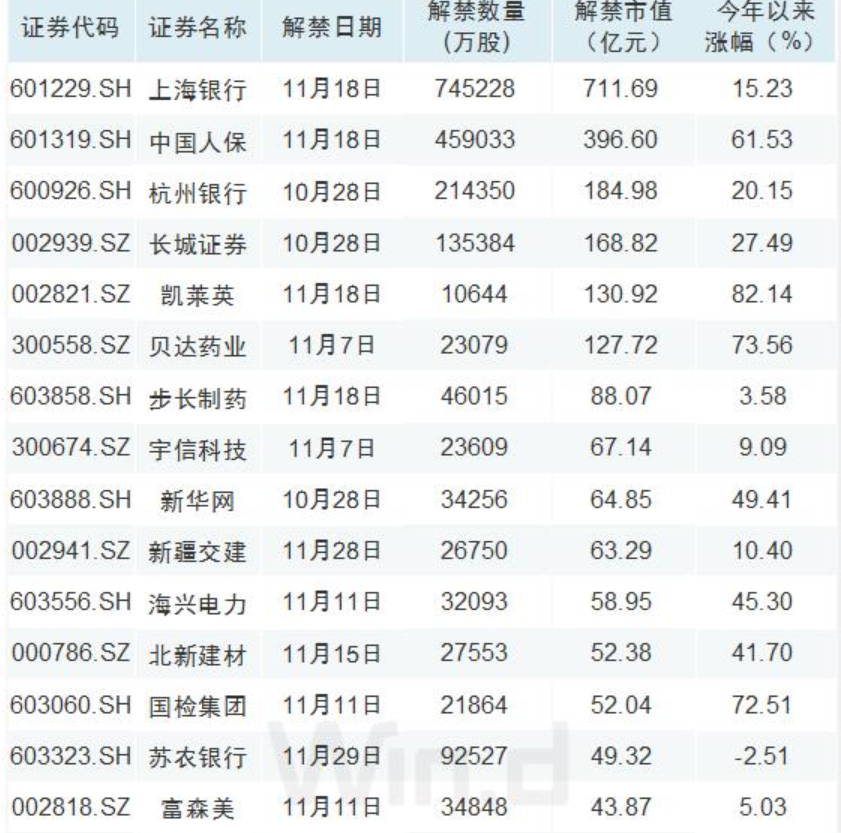截止11月中旬解禁市值靠前公司如下: