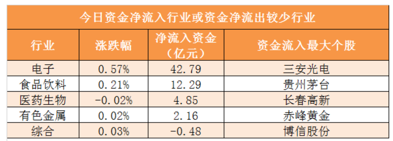 資金流向:28個(gè)申萬(wàn)一級(jí)行業(yè)中,4個(gè)行業(yè)實(shí)現(xiàn)資金凈流入,其中電子行業(yè)凈流入42.79億元居首。