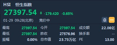 恒生指數(shù)開盤跌179.42點(diǎn)或0.65%,報(bào)27397.54點(diǎn)。國企指數(shù)跌0.45%,報(bào)10833.6點(diǎn)。紅籌指數(shù)跌0.79%,報(bào)4304.49點(diǎn)。大市盤前成交22.86億港元。