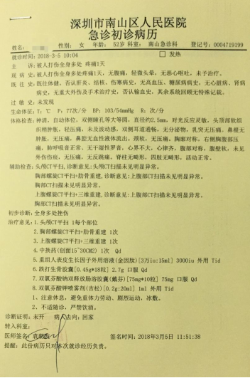 第二天,張女士立刻去深圳市南山區(qū)人民醫(yī)院急診科就診,初步診斷為“全身多處挫傷”。羅小姐說,“當(dāng)時(shí)的法醫(yī)鑒定結(jié)果是輕微傷,法醫(yī)鑒定貼好封條交給了派出所?!?/p>