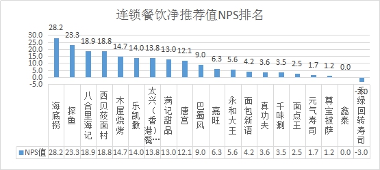 在本次調(diào)研中,20個(gè)連鎖餐飲品牌包括三類:中式正餐(海底撈、探魚、八合里海記、西貝筱面村、木屋燒烤、太興(香港)餐廳、唐宮、巴蜀風(fēng)、千味涮)、中式快餐(嘉旺、永和大王、真功夫、面點(diǎn)王)、特色餐飲(樂凱撒、滿記甜品、面包新語、元?dú)鈮鬯?、尊寶披薩、鑫泰、禾綠回轉(zhuǎn)壽司)。整體的平均凈推薦值為9.4分。排名第一的是海底撈,凈推薦值為28.2分;其次是探魚,凈推薦值為23.3分;第三名是八合里海記,凈推薦值為18.9分。