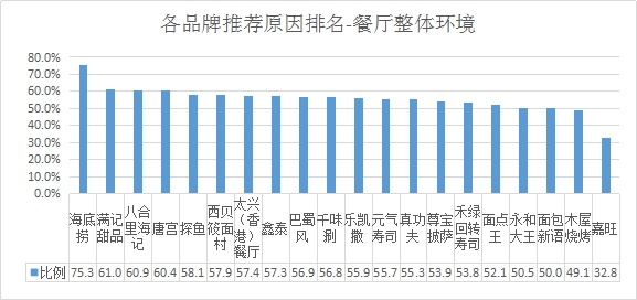 餐廳整體環(huán)境推薦率排名:排名前三的是海底撈、滿記甜品、八合里海記;
