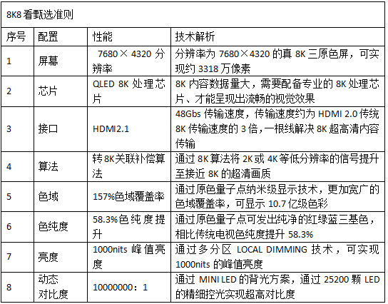 在行業(yè)趨勢及國家政策的雙重推動下,為正確引導8K電視市場發(fā)展方向、加快發(fā)展步伐,TCL聯(lián)合國家廣播電視產(chǎn)品質量監(jiān)督檢驗中心經(jīng)過長時間的市場調(diào)研及總結,從行業(yè)整體的角度對8K電視進行了初步探討,并編制出《8K8看甄選白皮書》。這份白皮書告訴我們,實現(xiàn)真正的8K震撼視覺體驗關鍵性能/技術要求如下。