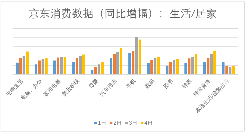 外出旅游如火如荼,“宅”在家中的朋友也不甘寂寞,趁著長假期間在京東平臺上為自己、家人或朋友挑選稱心的商品無疑是最佳的選擇。寵物生活、電腦、母嬰、美妝護(hù)膚、汽車用品、手機(jī)數(shù)碼等商品的銷量在1-4日內(nèi)持續(xù)增長,其中受“京東超級品牌日”等因素影響,手機(jī)類商品的銷售增長在3日達(dá)到峰值;有意思的是,一些看似與節(jié)日無關(guān)的消費(fèi)如圖書、鐘表等相比去年也有較大的漲幅,體現(xiàn)了消費(fèi)者的多元化需求;而國慶期間的“結(jié)婚潮”則拉高了珠寶首飾的相關(guān)銷售。
