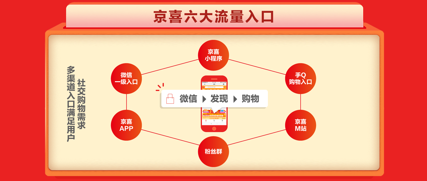京喜是京東以全面升級(jí)的拼購(gòu)業(yè)務(wù)為核心,以微信一級(jí)入口為主要載體,基于六大移動(dòng)端渠道打造的全域社交電商平臺(tái)。