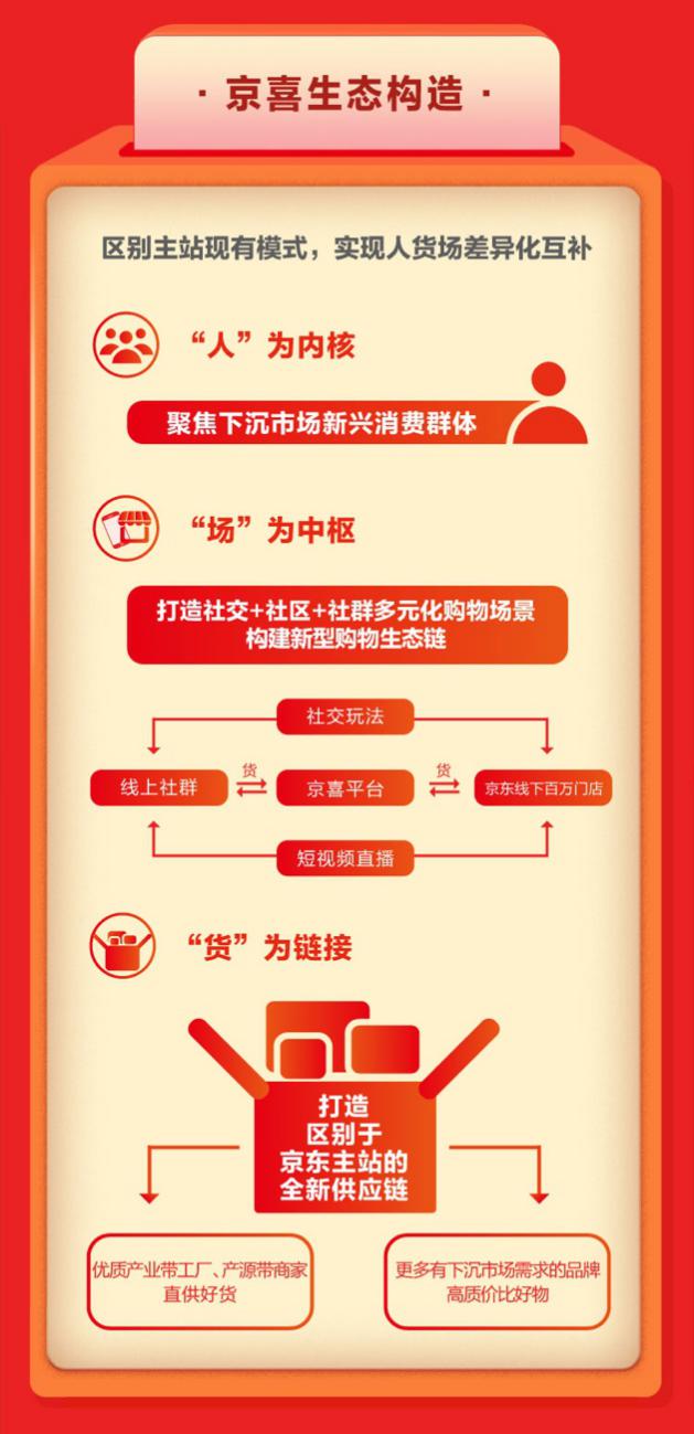 今年,京東打造了區(qū)別于京東主站現(xiàn)有場(chǎng)景和模式的全新平臺(tái)——京喜,于9月19日正式上線。京喜聚焦于下沉新興市場(chǎng)消費(fèi)人群,通過(guò)高質(zhì)價(jià)比好貨及豐富的社交玩法,與京東主站實(shí)現(xiàn)了“人”、“貨”、“場(chǎng)”的差異化互補(bǔ)。