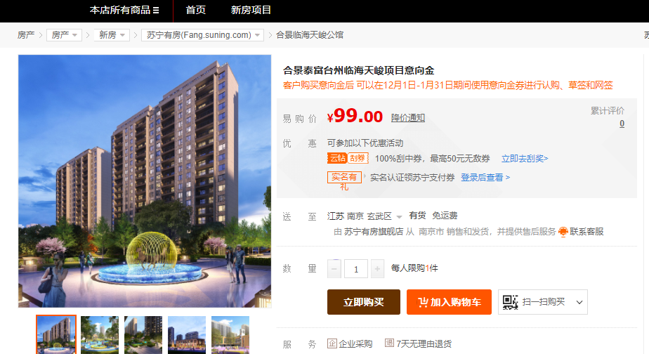 購房者在蘇寧易購首頁進(jìn)入“新房特惠”專題,選擇意向房源,購買99元意向金之后,可優(yōu)先購買雙十二特價(jià)房。