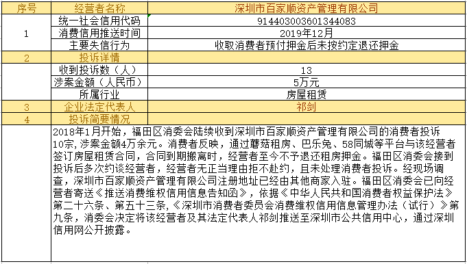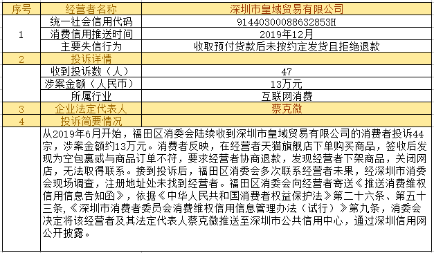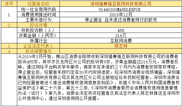 深圳新聞網(wǎng)2019年12月24日訊12月24日,為加強(qiáng)對商品和服務(wù)的社會監(jiān)督,推進(jìn)消費(fèi)領(lǐng)域信用體系建設(shè),深圳市消費(fèi)者委員會(以下簡稱“深圳市消委會”)聯(lián)合福田區(qū)消費(fèi)者委員會(以下簡稱“福田區(qū)消委會”)和龍崗區(qū)消費(fèi)者委員會(以下簡稱“龍崗區(qū)消委會”)將深圳豬兼強(qiáng)互聯(lián)網(wǎng)科技有限公司、深圳市皇域貿(mào)易有限公司、深圳市百家順資產(chǎn)管理有限公司、深圳市予恩美容美發(fā)有限公司、深圳晶馨瑜伽有限公司等五家預(yù)付式和互聯(lián)網(wǎng)消費(fèi)領(lǐng)域停止?fàn)I業(yè)且未退還消費(fèi)者預(yù)付款項(xiàng)的經(jīng)營者及其主要負(fù)責(zé)人推送至深圳市公共信用中心,通過深圳信用網(wǎng)公開披露。