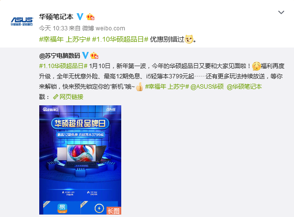 1月10日,今年的蘇寧易購華碩超品日將再次啟動,1月3日正式進(jìn)入預(yù)熱階段,今天早上蘇寧電腦數(shù)碼官微賬號,發(fā)布了今年華碩超級品牌日活動的正式信息,華碩官方賬號也第一時(shí)間與之進(jìn)行了回應(yīng)互動。