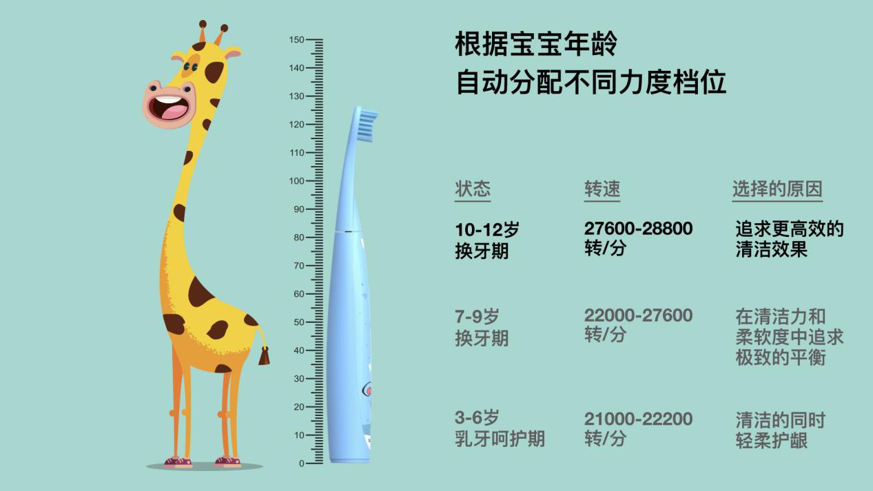 根據(jù)孩子的乳牙期、換牙期以及相應年齡段特點,S7000K可以自動分配不同的轉(zhuǎn)速力度檔位功能,分階呵護,讓孩子刷牙放心無憂。