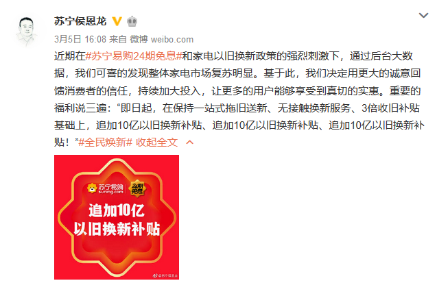 繼官宣24期免息政策后,蘇寧侯恩龍3月5日再發(fā)聲,微博表示將在315節(jié)點(diǎn)重磅加碼以舊換新業(yè)務(wù),“即日起,在保持一站式以舊換新、無(wú)接觸換新服務(wù)、3倍收舊補(bǔ)貼基礎(chǔ)上,追加10億以舊換新補(bǔ)貼”。
