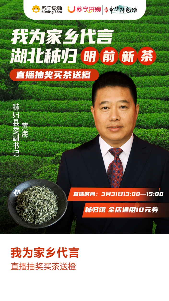 縣長(zhǎng)直播帶貨已成風(fēng)潮,其中誕生了不少網(wǎng)紅案例。3月31日,蘇寧拼購(gòu)將邀請(qǐng)湖北秭歸縣縣委副書(shū)記黃海亮相直播,為全網(wǎng)消費(fèi)者帶來(lái)地道的秭歸農(nóng)產(chǎn)品。