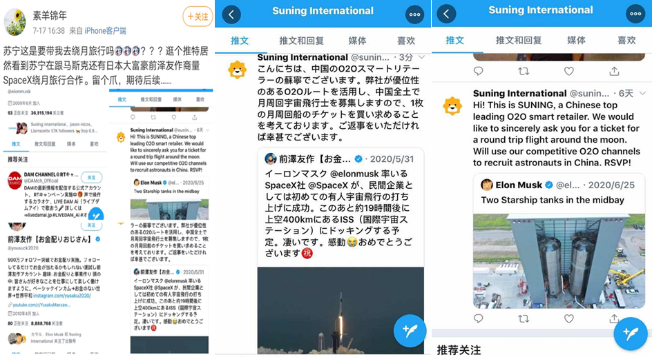 一個馬斯克,一個前澤友作,這趟萬眾矚目的繞月之旅原本跟我們國內(nèi)是沒什么關(guān)系的,但因為蘇寧的出現(xiàn)突然有了轉(zhuǎn)機。有微博用戶爆料,蘇寧7月中時候就在推特向馬斯克及前澤友作分別拋出合作求繞月旅行船票的橄欖枝。