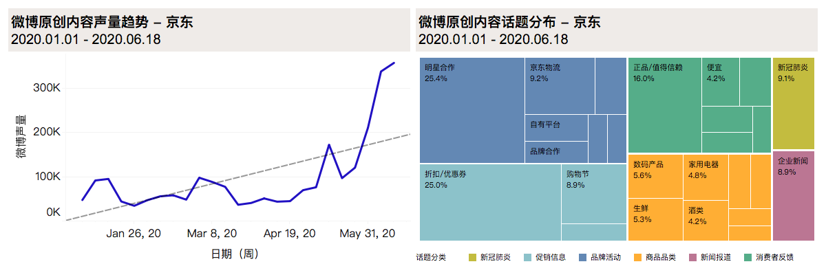 6月與疫情相關(guān)的話題內(nèi)容已降至全部話題的3%,表明用戶對疫情的關(guān)心已逐漸轉(zhuǎn)回到京東平臺核心功能上,即平臺的電商本質(zhì)。在用戶體驗(yàn)方面的反饋中,提及“京東值得信賴”的內(nèi)容占比近45%。京東在疫情爆發(fā)期間包括物資捐贈,醫(yī)療物資運(yùn)輸?shù)仍趦?nèi)的舉措使京東得到了社交媒體用戶的肯定與贊揚(yáng)。在618購物節(jié)開始后,用戶對京東平臺的討論也更多集中在“平臺大”、“信得過”等方面。