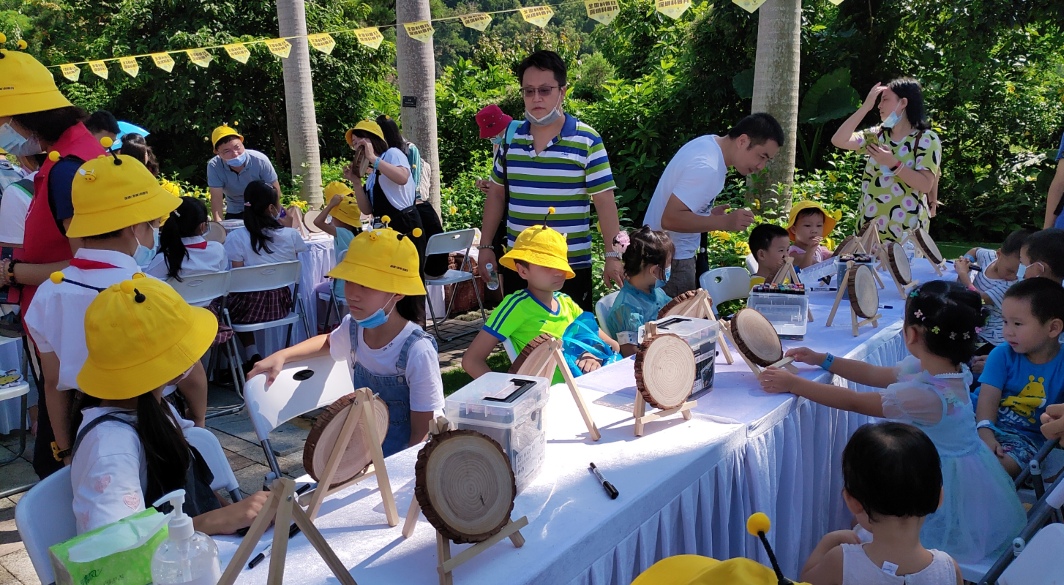 在自然課堂,分為科普展覽區(qū)、繪畫活動區(qū)和蜂產(chǎn)品體驗區(qū),孩子們戴著黃色的卡通帽子,像一只只勤勞的小蜜蜂忙碌地參與各項活動。在科普展板前,他們認(rèn)真記錄蜜蜂的基本知識、品質(zhì)精神,了解蜜蜂與人類的關(guān)系、保護生物多樣性的重要性,家長們結(jié)合展板耐心講解《深圳經(jīng)濟特區(qū)科學(xué)技術(shù)普及條例》、全國科普日、深圳科普月等知識。