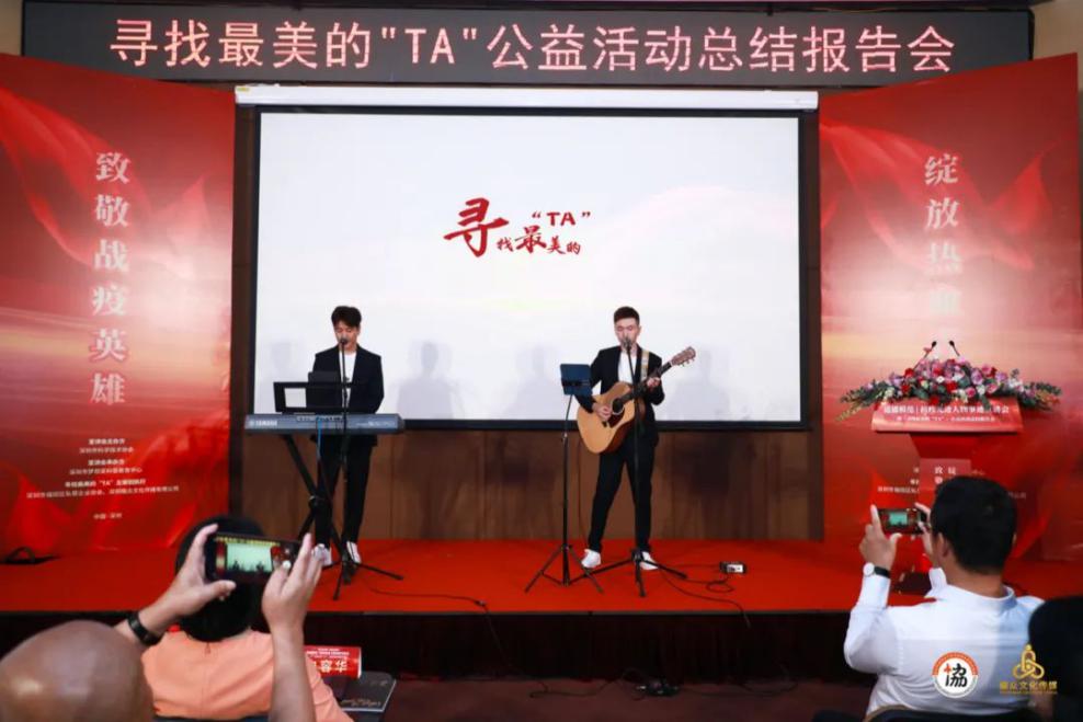 活動尾聲,會場響起一首滿懷敬意及祝愿的歌聲——尋找最美的“TA”公益活動主題曲《無名英雄》。這是由畢業(yè)于中國音樂學(xué)院并多次參演央視春晚、與郎朗同臺演奏的孫培軒與民謠吉他創(chuàng)作歌手強曉龍共同親情獻唱的原創(chuàng)戰(zhàn)疫歌曲,現(xiàn)場的各位嘉賓及觀眾無不感動,感謝無名的英雄們用那堅如磐石的雙肩,踐行著初心使命及鏗鏘有力的誓言。