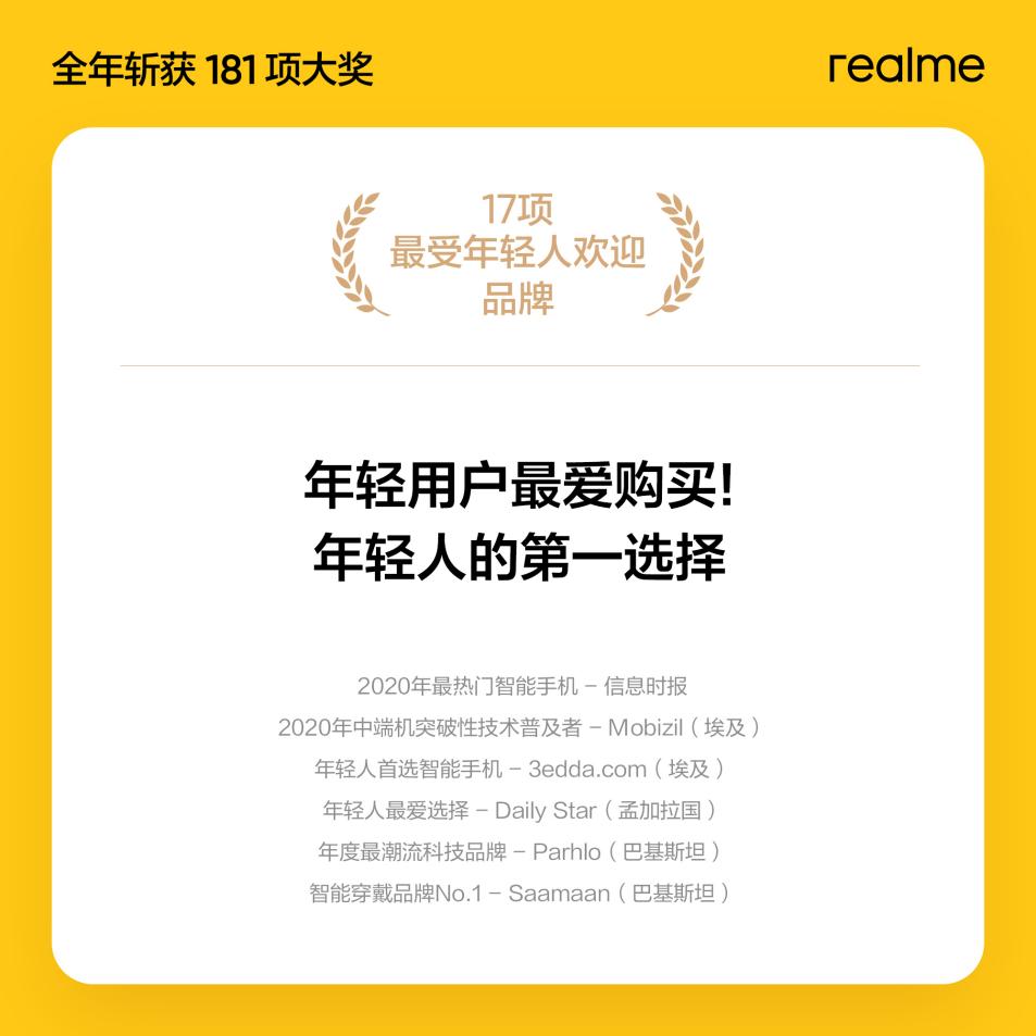 自創(chuàng)立以來,realme一直面向年輕用戶群體,基于對年輕人審美與偏好的精準(zhǔn)洞察與理解,不斷滿足和超越年輕科技愛好者的需求,這一策略在東南亞、南亞、歐洲、非洲等市場獲得極大認可。2020年,全球給予realme“年輕人最喜愛品牌”等相關(guān)獎項達17項,用實力證明realme是“年輕人第一選擇”。同時,realme一舉網(wǎng)羅全球各大產(chǎn)品獎項,充分證實了“好產(chǎn)品會說話,產(chǎn)品才是硬實力”這句被商界奉為圭臬的卓見。