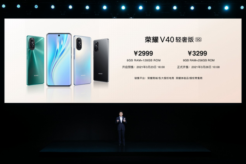 榮耀V40輕奢版擁有幻夜黑、藍(lán)水翡翠和鈦空銀三種配色,提供8GB+128GB、8GB+256GB兩個(gè)內(nèi)存版本,售價(jià)分別為2999元和3299元。3月26日10:08在線上線下全平臺(tái)開(kāi)售,用戶可通過(guò)榮耀商城及各大授權(quán)電商平臺(tái)或前往榮耀線下體驗(yàn)店、榮耀授權(quán)零售門店進(jìn)行購(gòu)買。