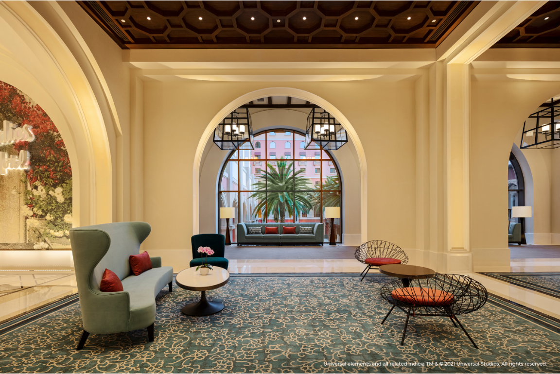 環(huán)球影城大酒店位于北京環(huán)球影城主題公園入口,入住賓客將可以俯瞰園區(qū)的絕佳景觀。作為全球首家以環(huán)球品牌命名的主題酒店,環(huán)球影城大酒店在設(shè)計(jì)中融入了極具加州特色的西班牙復(fù)興風(fēng)格,巧妙再現(xiàn)好萊塢電影黃金時(shí)代的輝煌與風(fēng)華,同時(shí)結(jié)合了中性色調(diào)的現(xiàn)代演繹以及繽紛色彩點(diǎn)綴。酒店大堂內(nèi)西班牙風(fēng)格的噴泉和玻璃馬賽克三角梅花墻帶來(lái)輕快靈動(dòng)的熱帶海岸氣息,定制的橙花調(diào)香氛則令人仿佛置身加州,讓賓客感受到典雅而充滿活力的度假氛圍。酒店公共區(qū)域內(nèi)的珍貴電影海報(bào)將帶領(lǐng)賓客探尋動(dòng)人心扉的光影世界背后,精彩絕倫卻不為人知的創(chuàng)作瞬間。從復(fù)古經(jīng)典系列,到現(xiàn)代電影杰作,更有大量的幕后花絮呈現(xiàn)一段歷久彌新的電影之旅,回溯環(huán)球超過(guò)一個(gè)世紀(jì)的電影歷史的光輝歷程,致敬品牌在光影史上的耕耘與貢獻(xiàn)。