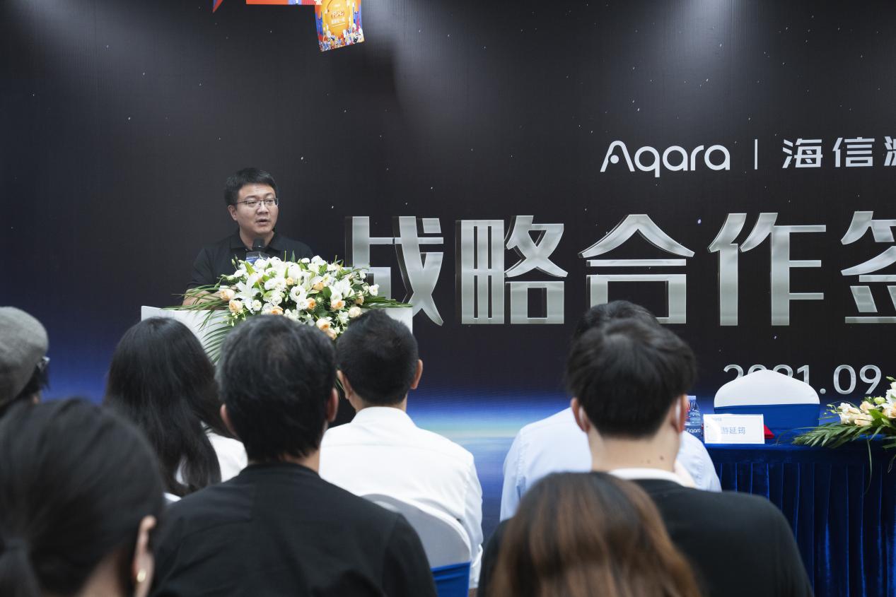 致辭環(huán)節(jié),海信集團控股公司副總裁于芝濤也發(fā)來了線上祝福視頻,表達了對這次雙方合作,共同致力全屋智能美好體驗再升級的美好祝愿。與此同時,青島海信激光顯示股份有限公司的副總經(jīng)理王偉介紹了海信電視在戰(zhàn)略發(fā)展方向上的重塑新定位、新技術應用、產(chǎn)品優(yōu)勢以及所取得的階段性成就等,并表示Aqara作為全球智慧生活方式的先行者和引領者,致力于打造「千人千面」的全屋智能生活方式,要做更懂用戶的“家”,這和海信電視“顯示無處不在,服務無處不在,連接無處不在”的發(fā)展理念不謀而合。除去智能化,雙方與生俱來的“綠色基因”更加夯實了這種合作契因,并始終堅信,未來海信電視與Aqara將會不斷用綠色智能科技提升大家的家居生活品質(zhì),打造大屏時代的綠色客廳,引領中國IoT的發(fā)展。