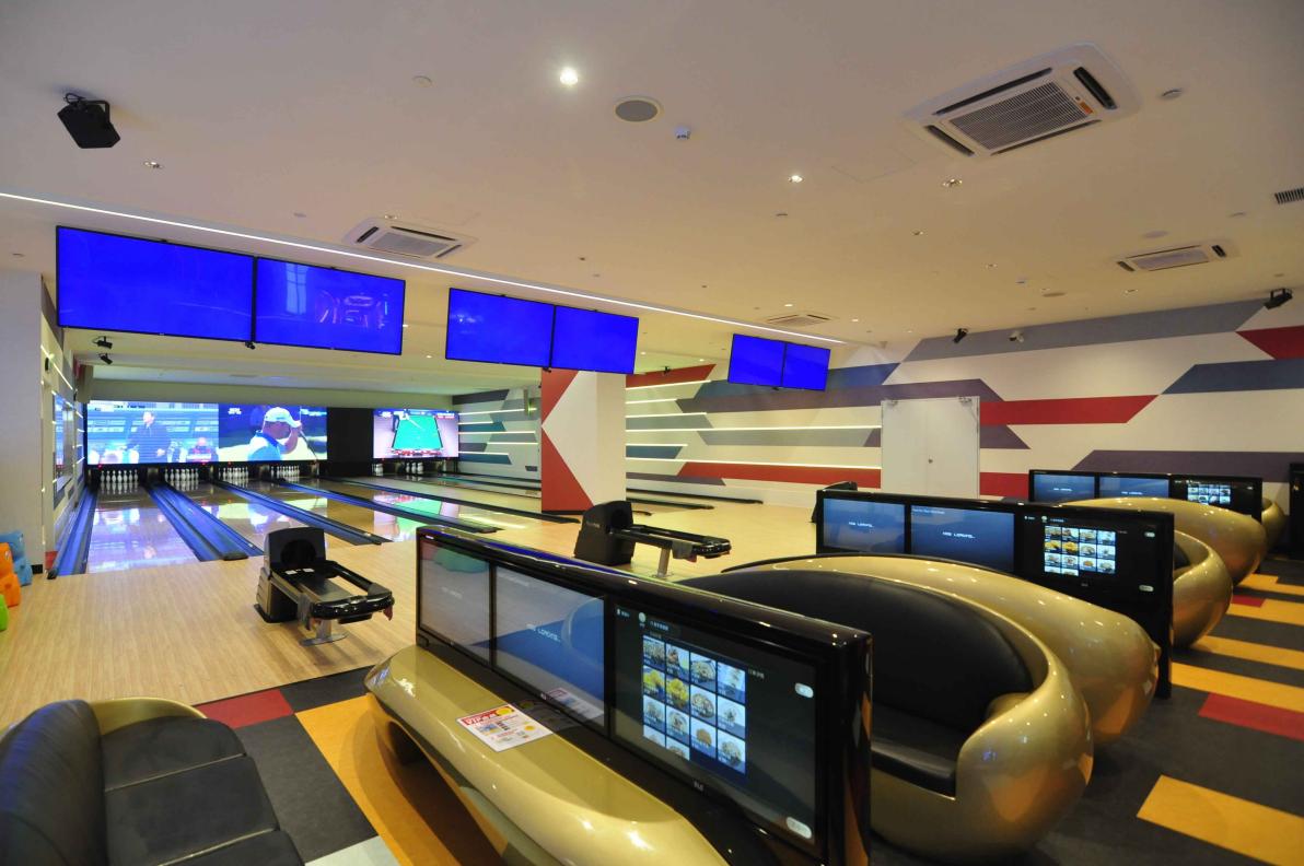 保齡球區(qū)域,朗玩的保齡球采用了美國Brunswick公司最新的保齡球機。在放置保齡球瓶的上方墻面上,設置了放映各種運動、音樂節(jié)目的大屏幕。四周設有的攝像鏡頭能夠全方位捕捉玩家們投球瞬間,在大屏幕上可以看到這些精彩瞬間。采用了鐳射光線等技術的華麗活動(月光投球游戲)每小時都會進行一次,閃耀炫酷的設計會顛覆玩家們一直以來對于保齡球的認知!