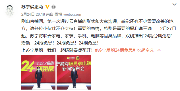 2月24日晚8點(diǎn),一場(chǎng)特殊的線上發(fā)布會(huì)在蘇寧矩陣直播平臺(tái)全面啟動(dòng)。蘇寧侯恩龍化身主播,宣布開(kāi)啟一場(chǎng)公司復(fù)工與市場(chǎng)復(fù)蘇的“救市”行動(dòng),拉開(kāi)家電銷(xiāo)售破局大幕。