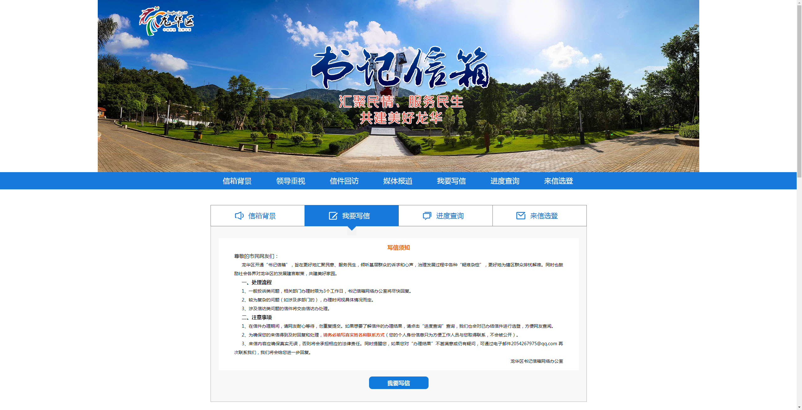 龍華區(qū)“書記信箱”網(wǎng)絡(luò)平臺(tái)是由龍華區(qū)領(lǐng)導(dǎo)的指導(dǎo)下搭建的網(wǎng)絡(luò)信息平臺(tái),由深圳新聞網(wǎng)團(tuán)隊(duì)進(jìn)行開發(fā)搭建?!皶浶畔洹钡臉?gòu)建,是龍華區(qū)委貫徹落實(shí)黨的群眾路線,踐行“三嚴(yán)三實(shí)”的一項(xiàng)新舉措?!皶浶畔洹弊?015年10月31日正式上線以來(lái),逐步成為龍華市民向龍華區(qū)委反映、提出建議、意見和投訴請(qǐng)求的重要渠道。