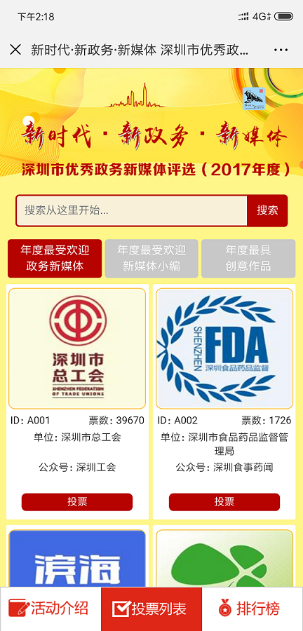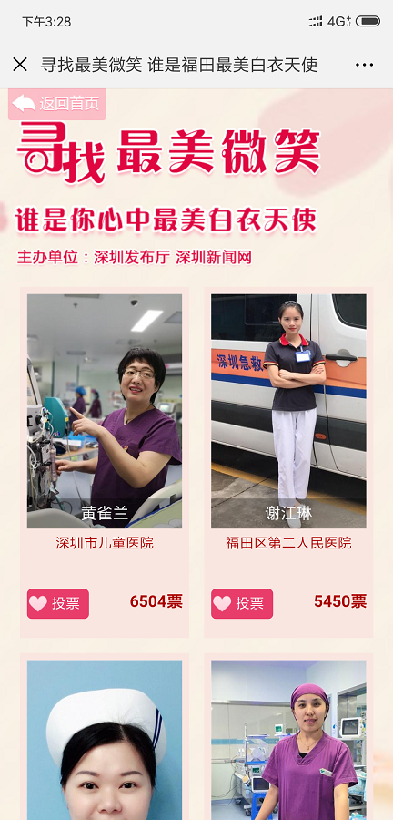 ② 多個(gè)投票活動(dòng)已經(jīng)形成良好群眾效應(yīng),合作方主辦方多屆舉辦,每屆舉辦均由深圳新聞網(wǎng)負(fù)責(zé)投票系統(tǒng)開發(fā),例如:健康場所投票、集團(tuán)攝影大賽評選投票、政務(wù)類投票。形成了良好品牌效應(yīng)和示范,往往一個(gè)區(qū)舉辦的投票活動(dòng)其他區(qū)會跟進(jìn)舉辦,形成系列投票,例如:“最美護(hù)士”系列投票,“最美醫(yī)生”系列投票,“最美教師”系列投票,“最佳政務(wù)”系列投票等;