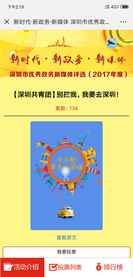 作為中國"最互聯(lián)網(wǎng)城市〃,深圳近年來大力建 設(shè)政務(wù)新媒體平臺矩陣,不斷建立健全工作機(jī)制,搭 建起為市民服務(wù)的新渠道、新平臺,涌現(xiàn)出許多優(yōu)秀 的政務(wù)新媒體。廣大市民網(wǎng)友,有哪些政務(wù)微信么, 讓你"欲罷不能〃,有哪位小編讓你〃刻骨銘心〃, 有哪些作品讓你"秒轉(zhuǎn)秒贊"?請為他們投上寶貴一 票吧!本次投票活動(dòng)作為"新時(shí)代新政務(wù)備體"—— 深圳市優(yōu)秀政務(wù)新媒體評選(2017年度)活動(dòng)的重要 組成部分,其結(jié)果將作為專家評審類獎(jiǎng)項(xiàng)評選的重要 參考細(xì),權(quán)重占比50%。