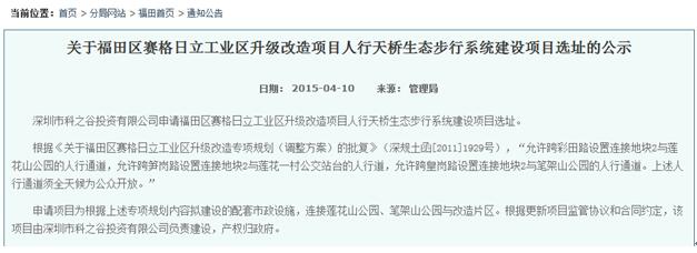而據(jù)資料記載,市規(guī)土委曾經(jīng)在2015年4月10日,在福田管理局官網(wǎng)上發(fā)布了《關(guān)于福田區(qū)賽格日立工業(yè)區(qū)升級改造項(xiàng)目人行天橋生態(tài)步行系統(tǒng)建設(shè)項(xiàng)目選址的公示》,其中明確提到“根據(jù)《關(guān)于福田區(qū)賽格日立工業(yè)區(qū)升級改造專項(xiàng)規(guī)劃(調(diào)整方案)的批復(fù)》(深規(guī)土函[2011]1929號),‘允許跨彩田路設(shè)置連接地塊2與蓮花山公園的人行通道,允許跨筍崗路設(shè)置連接地塊2與蓮花一村公交站臺的人行道,允許跨皇崗路設(shè)置連接地塊2與筆架山公園的人行通道。上述人行通道須全天候?yàn)楣婇_放’?!?/p>