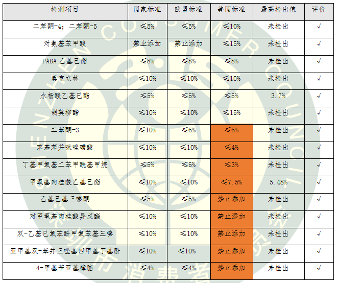 防曬化妝品在美國(guó)按非處方藥(OTC)管理,新的防曬劑當(dāng)作新藥品來批準(zhǔn),審評(píng)要求非常嚴(yán)格。本次比較試驗(yàn)測(cè)試的15類化學(xué)防曬劑按照國(guó)標(biāo)、歐標(biāo)和美標(biāo)中最嚴(yán)格的標(biāo)準(zhǔn)進(jìn)行評(píng)價(jià)。我國(guó)允許使用的5類化學(xué)防曬劑在美國(guó)被禁止使用,還有4類化學(xué)防曬劑在美國(guó)的限量要求更加嚴(yán)格。