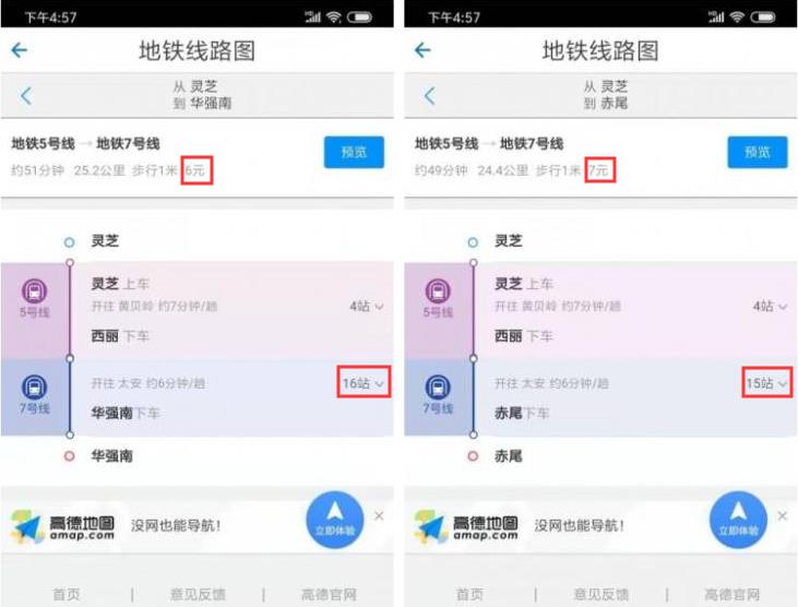 地鐵集團(tuán)隨后跟帖發(fā)布回應(yīng),據(jù)介紹,深圳地鐵的票價(jià)實(shí)行“里程分段計(jì)價(jià)票制”,以最短路徑原則確定計(jì)費(fèi)路徑。計(jì)費(fèi)路徑與乘客實(shí)際出行路徑、軟件計(jì)算的最便捷路徑或耗時(shí)最短路徑無(wú)關(guān)。深圳地鐵集團(tuán)還舉例說(shuō)明:從5號(hào)線(xiàn)靈芝站到7號(hào)線(xiàn)華強(qiáng)南站的里程最短路徑是靈芝—西麗—車(chē)公廟—福田—華強(qiáng)北—華強(qiáng)南,全長(zhǎng)23.8公里,票價(jià)為6元。5號(hào)線(xiàn)靈芝站到7號(hào)線(xiàn)赤尾站的里程最短路徑為:靈芝—西麗—赤尾,全長(zhǎng)24.5公里,票價(jià)為7元。因此,“少坐一站多收一元”的情況并不存在。