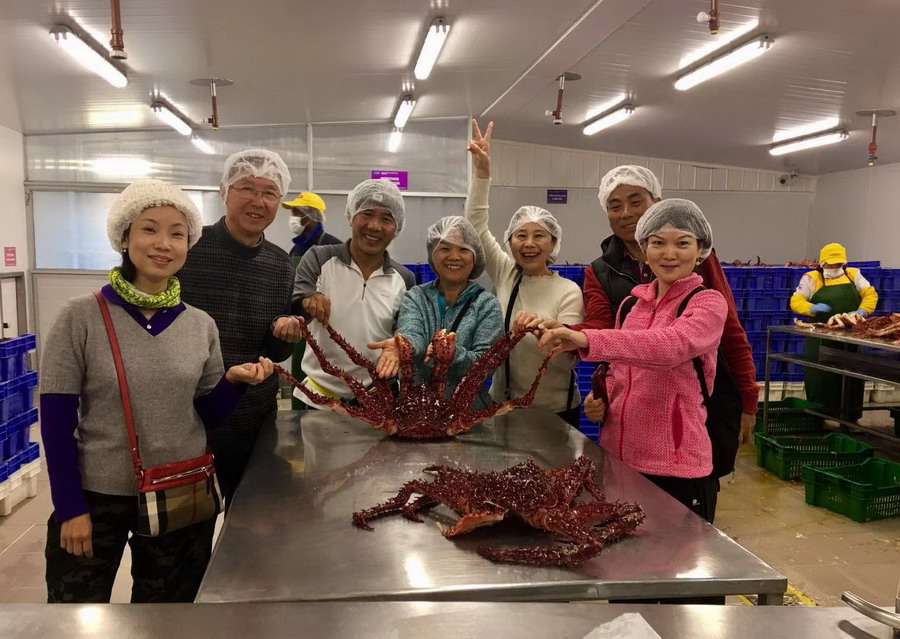 網(wǎng)友經(jīng)當(dāng)?shù)芈眯猩绲耐扑]到一家蜘蛛蟹貿(mào)易公司參觀并在其附設(shè)的餐廳品嘗了海鮮大餐。李仁奇攝