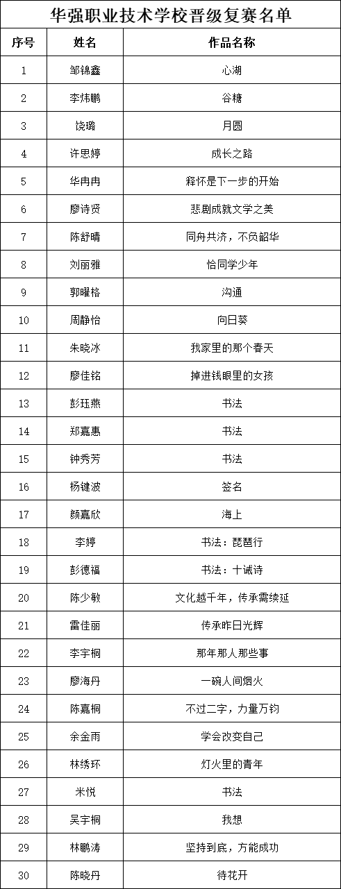 自2021年1月,活動(dòng)征稿啟動(dòng)以來,獲得了深圳市廣大中小學(xué)生、教師、文學(xué)愛好者的熱烈響應(yīng)積極參與,吸引了深圳百余所學(xué)校的上萬人關(guān)注報(bào)名?,F(xiàn)公布福田區(qū)華強(qiáng)職業(yè)技術(shù)學(xué)校專場(chǎng)晉級(jí)復(fù)賽名單如下: