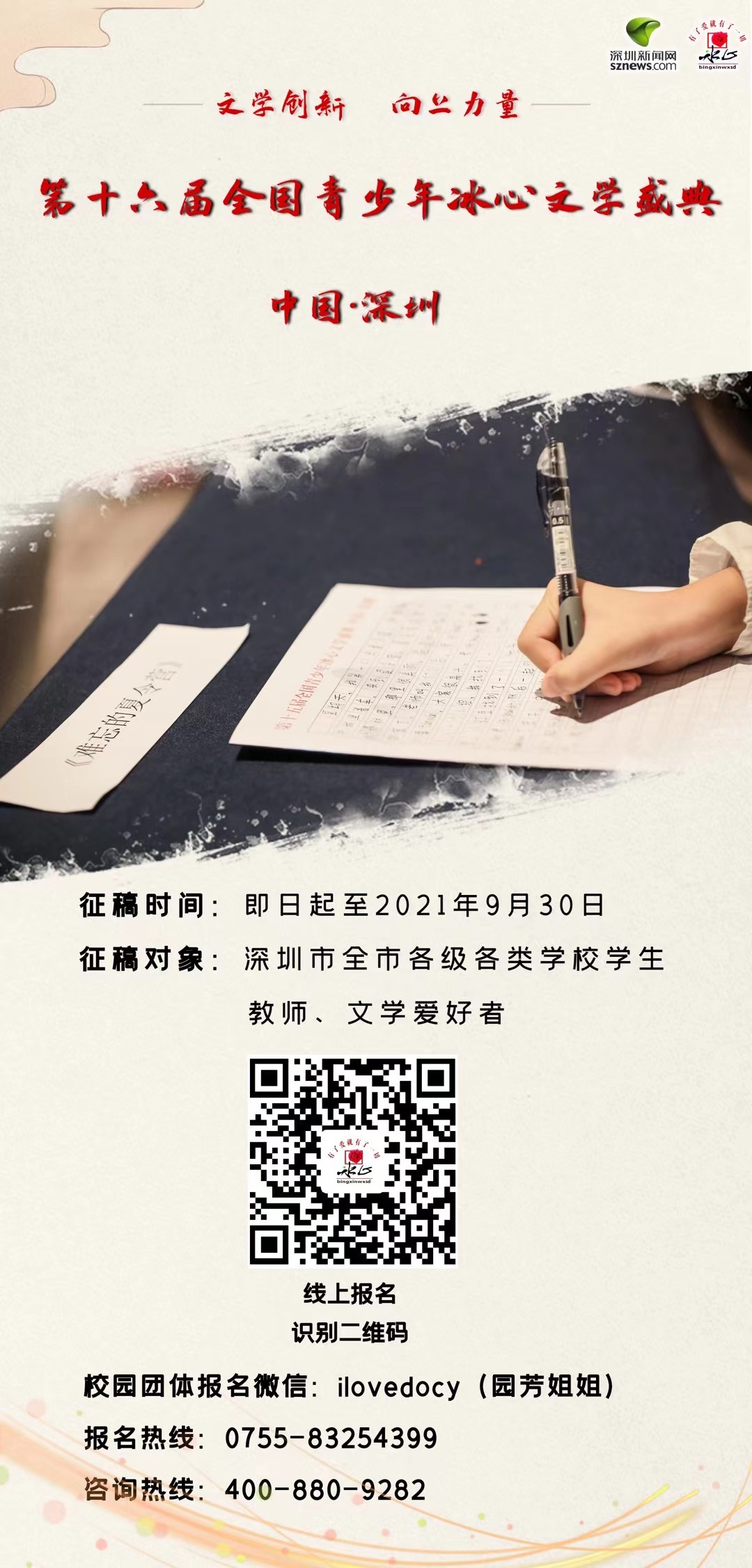 見圳客戶端·深圳新聞網(wǎng)2021年4月12日訊 為繼承和發(fā)揚(yáng)中華文化及冰心文學(xué)精神,促進(jìn)中華文化、中國現(xiàn)代化文學(xué)史更深入地植入深圳下一代青少年心中,2021年“第十六屆全國青少年冰心文學(xué)盛典中國·深圳”正在愛好文學(xué)的師生學(xué)友們之間熱烈展開。