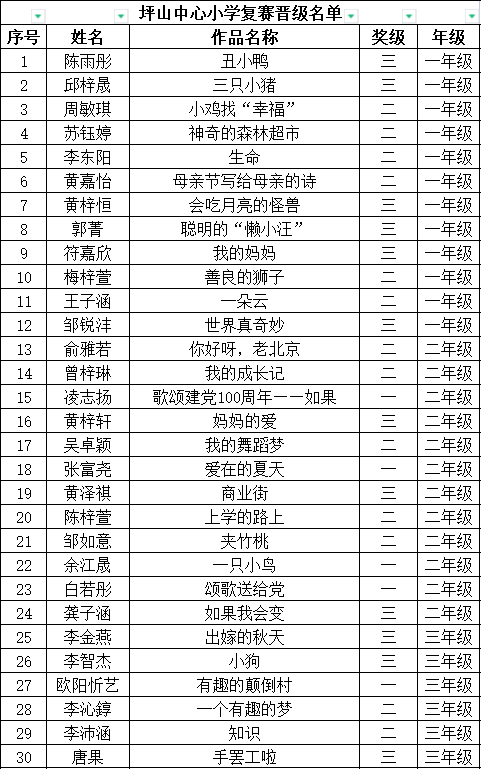 自2021年1月,活動(dòng)征稿啟動(dòng)以來,獲得了深圳市廣大中小學(xué)生、教師、文學(xué)愛好者的熱烈響應(yīng)積極參與,吸引了深圳百余所學(xué)校的上萬人關(guān)注報(bào)名?,F(xiàn)公布坪山區(qū)坪山中心小學(xué)晉級(jí)復(fù)賽名單如下: