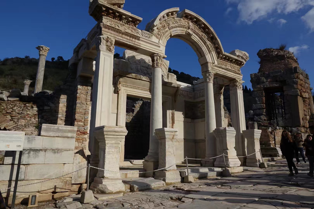 哈德良神廟就在圖書館斜對面,是典型柯林斯式神廟的代表,內(nèi)墻廊柱上有不同神話人物的雕刻,拱門上有精美的浮雕,前側(cè)拱門上是幸運女神的頭像,內(nèi)側(cè)拱門上是張開雙臂的蛇發(fā)女妖美杜莎的雕像。李仁奇 攝