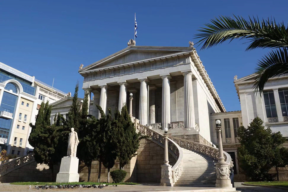 雅典在希臘獨(dú)立之后建了許多優(yōu)雅的新古典主義建筑,其中最著名的國家圖書館、國家科學(xué)院和雅典大學(xué)被稱為新古典主義三部曲,這三座建筑連在一起,蔚為壯觀,是這座城市的地標(biāo)。李仁奇 攝