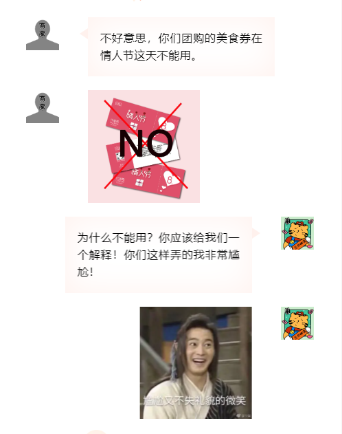 遇到春節(jié)、情人節(jié)等特殊時(shí)期,消費(fèi)者在團(tuán)購時(shí)應(yīng)當(dāng)看清使用期限,如商家未提前說明美食券的限用日期,而是去到現(xiàn)場才告知消費(fèi)者不能使用,則商家涉嫌侵害消費(fèi)者的知情權(quán)、公平交易權(quán)。如商家銷售美食券的頁面,注明情人節(jié)不能使用,此時(shí)商家盡到了提醒義務(wù),消費(fèi)者可在規(guī)定的其他時(shí)間內(nèi)使用美食券,或者向平臺(tái)申請(qǐng)退款。(消費(fèi)提示:消費(fèi)者購買團(tuán)購券時(shí),要仔細(xì)閱讀團(tuán)購頁面的使用說明,特別是要仔細(xì)瀏覽團(tuán)購券使用時(shí)限。限用人數(shù)等具體內(nèi)容,避免遭遇買了卻用不了的困境。)
