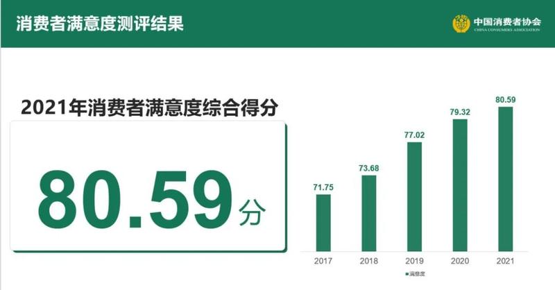 測評結(jié)果顯示,2021年度100個城市消費者滿意度綜合得分為80.59分,較2020年提高1.27分,且首次突破80分。