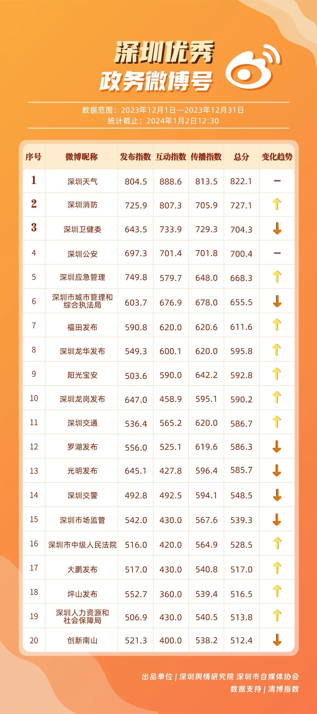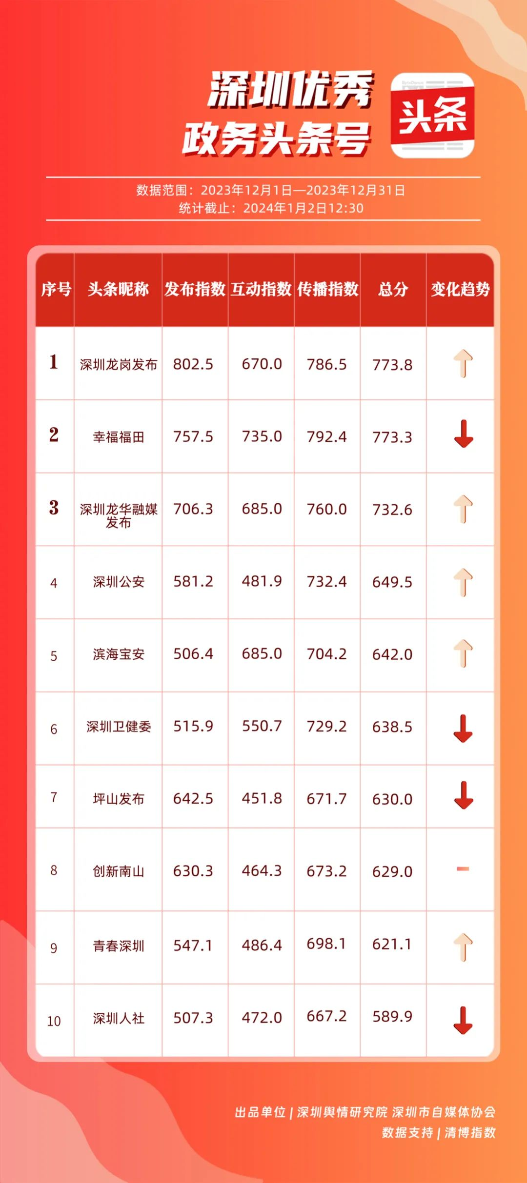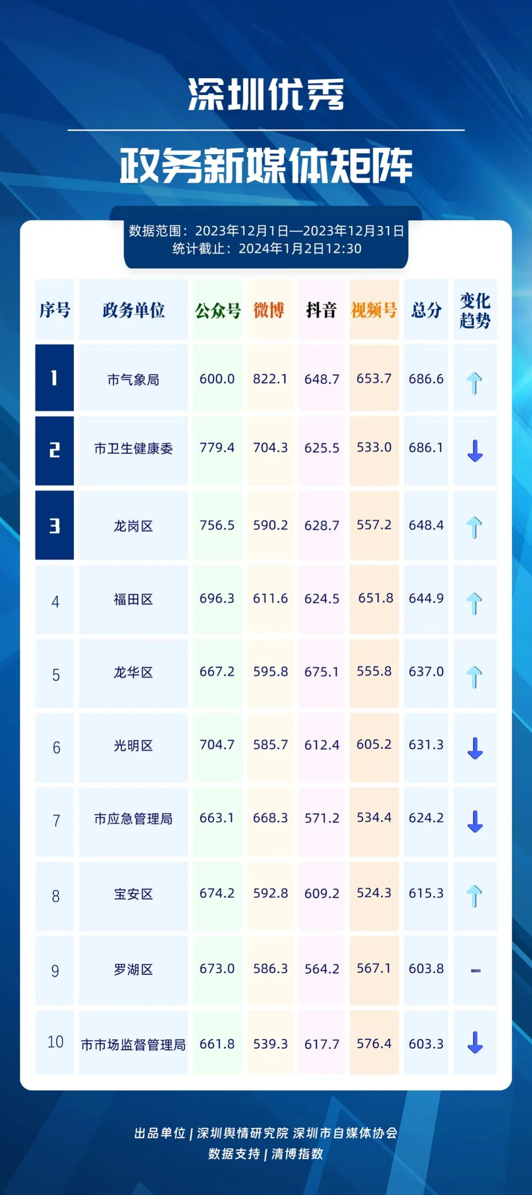 深圳新聞網(wǎng)1月16日訊(記者 陳曉君 實(shí)習(xí)生 張馳)2024年1月15日,《深圳優(yōu)秀政務(wù)新媒體矩陣》(2023年12月期)正式發(fā)布,共有10個(gè)新媒體矩陣被評(píng)為“優(yōu)秀”,分別是市氣象局、市衛(wèi)生健康委、龍崗區(qū)、福田區(qū)、龍華區(qū)、光明區(qū)、市應(yīng)急管理局、寶安區(qū)、羅湖區(qū)、市市場(chǎng)監(jiān)督管理局。上述優(yōu)秀矩陣在內(nèi)容質(zhì)量、更新頻率、粉絲互動(dòng)等方面穩(wěn)定性較高,獲得公眾的關(guān)注與支持。
