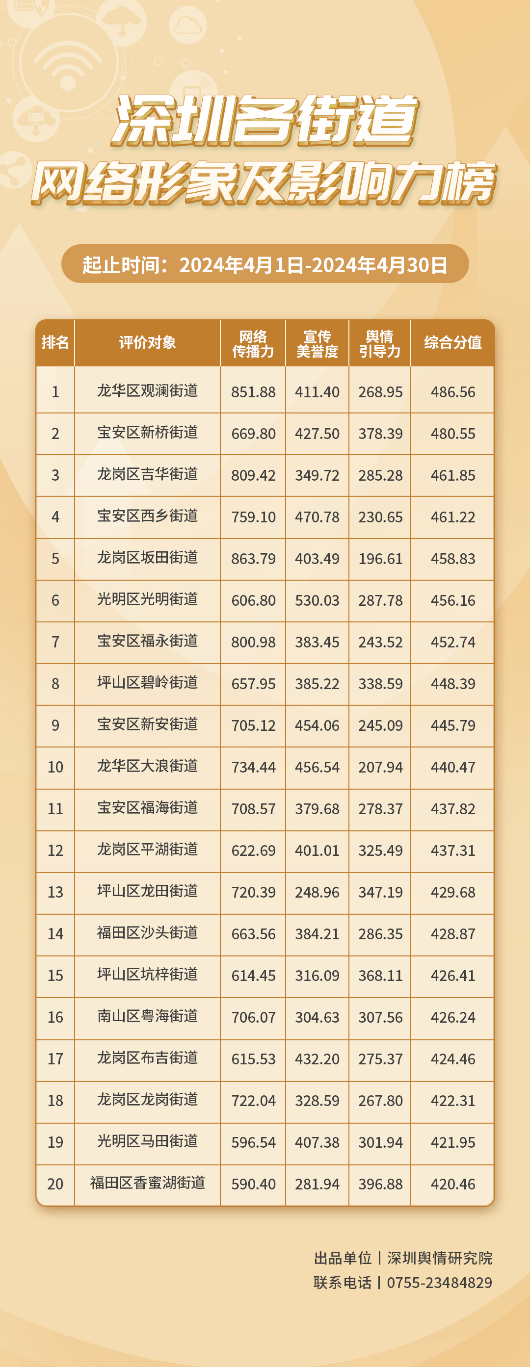 《深圳各街道網(wǎng)絡(luò)形象及影響力榜》由深圳輿情研究院編制推出,具有獨(dú)立客觀的評(píng)價(jià)體系,旨在深入了解深圳市各街道的網(wǎng)絡(luò)形象構(gòu)建狀況和社會(huì)影響,推動(dòng)街道治理“提質(zhì)增效”,增加城市高質(zhì)量發(fā)展動(dòng)能。
