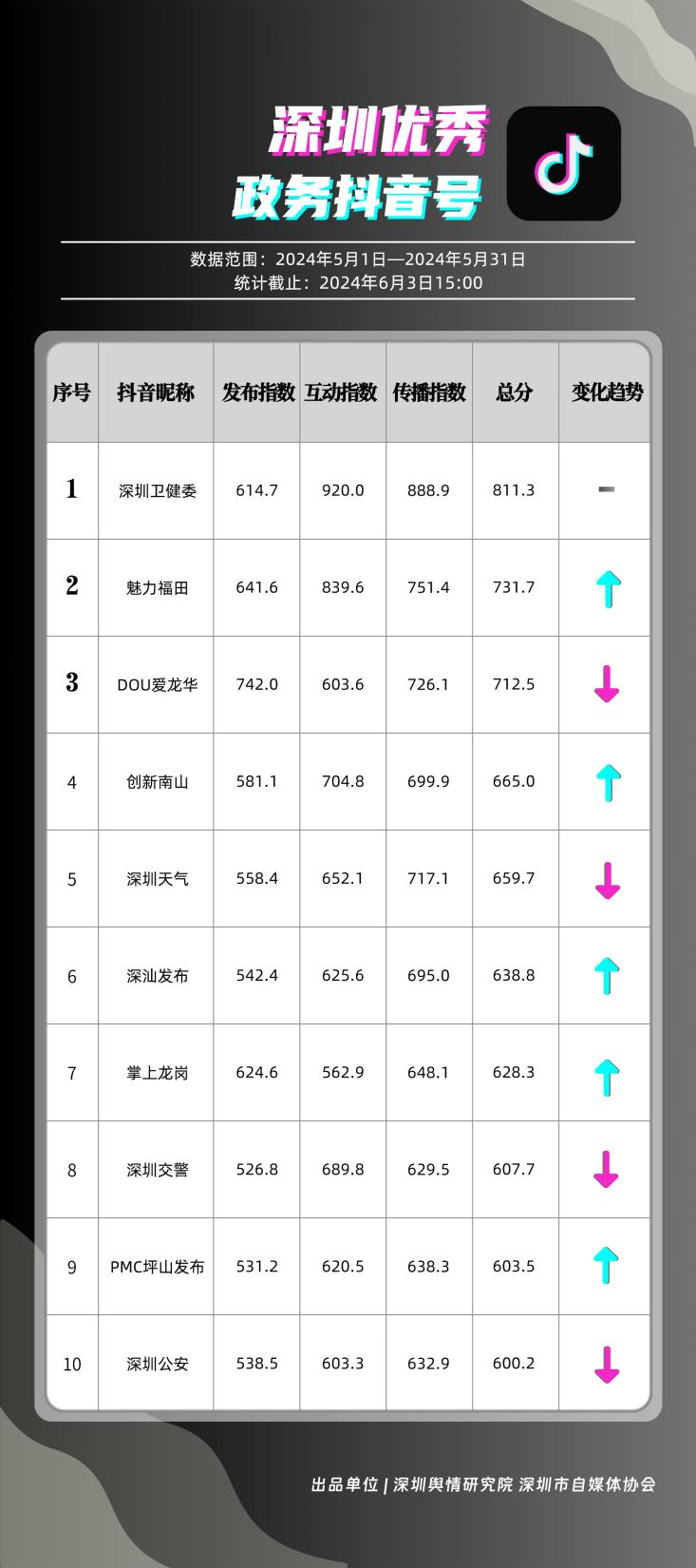 5月,共有10個政務抖音號獲得“深圳優(yōu)秀政務抖音號”稱號,分別是“深圳衛(wèi)健委”“魅力福田”“DOU愛龍華”“創(chuàng)新南山”“深圳天氣”“深汕發(fā)布”“掌上龍崗”“深圳交警”“PMC坪山發(fā)布”和“深圳公安”,多個政務抖音號能夠把握短視頻平臺宣傳要領,持續(xù)發(fā)布優(yōu)質信息內容,做到了政務便民化、政務信息傳播高效化,為政務信息發(fā)布模式開創(chuàng)新渠道樹立了良好典范。